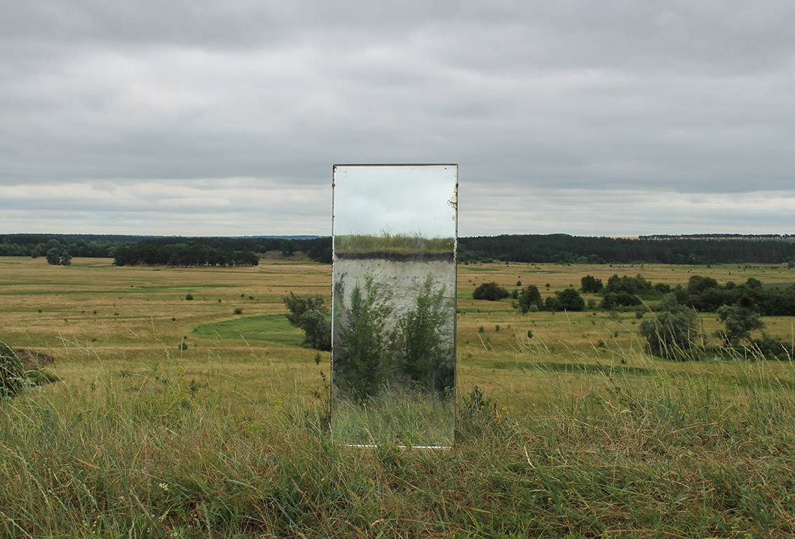The horizon functions as a line of orientation, a promise of distance and continuity. By inserting a mirror into the landscape, the work interrupts this stable formula. Reflection replaces perspective, returning the gaze back into the terrain and toward the viewer. The mirror neither opens a new space nor extends the horizon. Instead, it exposes the landscape as fragmented and unstable, where perception depends on position and movement. The border here is not geographical, but perceptual. It exists between image and reality, presence and reflection, inside and outside. In this borderline space, the horizon ceases to be a destination and becomes a mechanism.