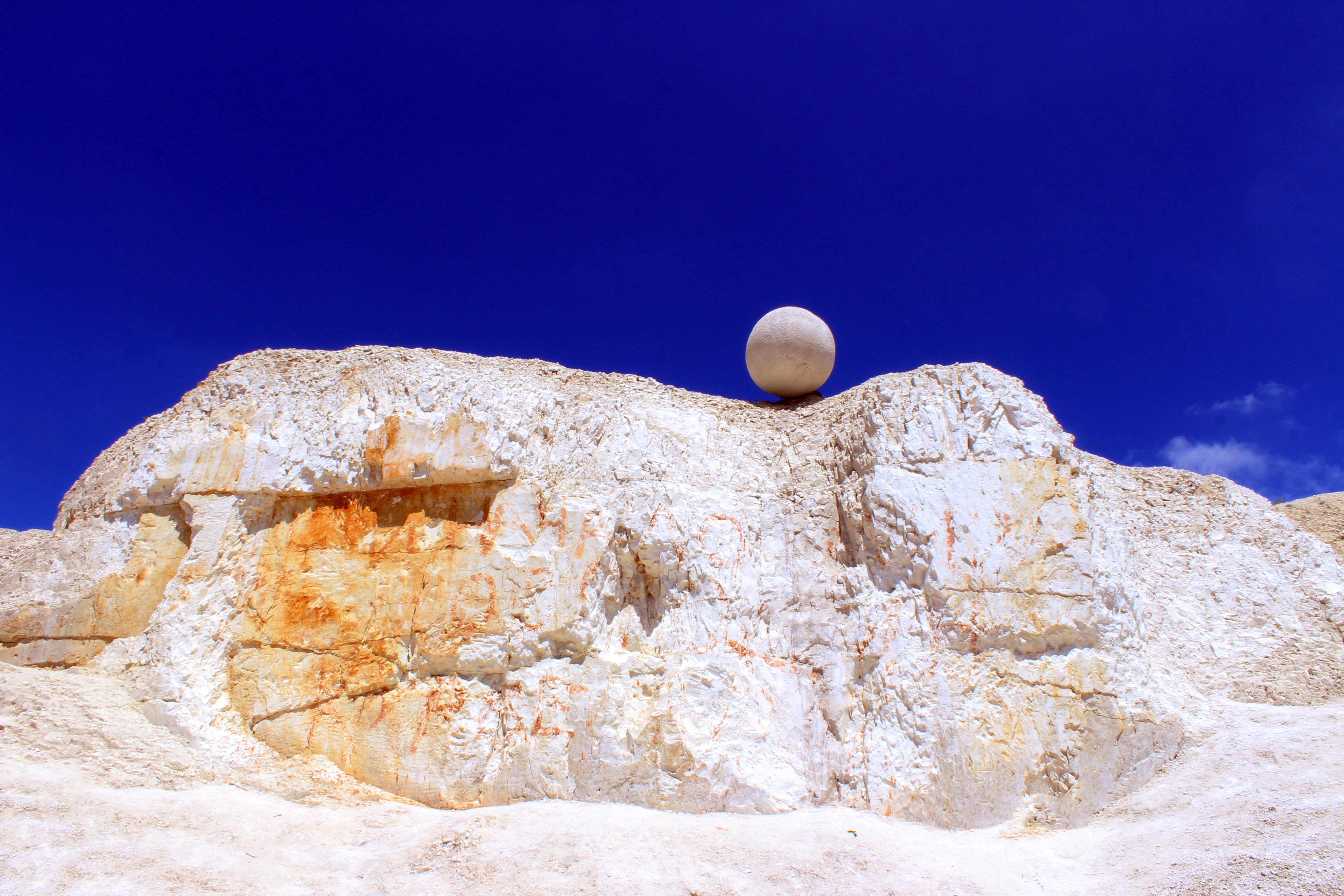 We chose to contain this material within a geometrically “perfect” form, the sphere. This decision reflects both an idealized notion of form and a material logic: under microscopic observation, chalk particles themselves appear rounded. The work thus connects geological structure and abstract geometry, linking material specificity with conceptual precision.